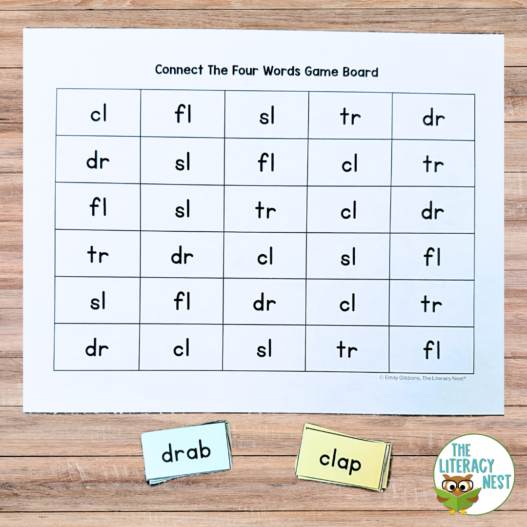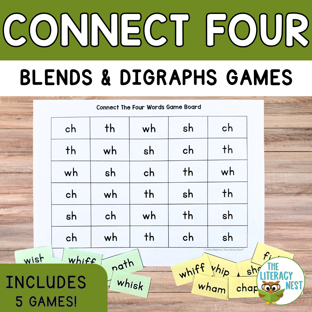 Build strong digraph and consonant blends decoding skills with Connect the Four Words, a set of 5 digraph and consonant blends phonics games inspired by classic four-in-a-row gameplay. Students draw a word card, read it aloud, and place it on the game board by matching the word to the correct digraph or consonant blend. Every turn includes real decoding practice, repeated reading, and meaningful review of digraph and consonant blends.