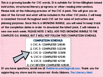 CVC words are some of the first and most common words in the English language that young readers learn to read. Using a multisensory approach to teach CVC words will ensure reading success for your students. This multisensory phonics bundle is suitable for reading intervention, the Orton-Gillingham approach or other structured literacy programs. It is compatible with Orton-Gillingham Level 1.This is a bundle for CVC words. Please download and look at the following preview of the CVC A pack. This will give you an idea of the format and what will be included in the other CVC packs. I keep a consistent format throughout each CVC set for ease of instruction and planning purposes.What is the savings?All six packs purchased separately would cost $19.50. The total cost of this bundle at a discounted price is $15.